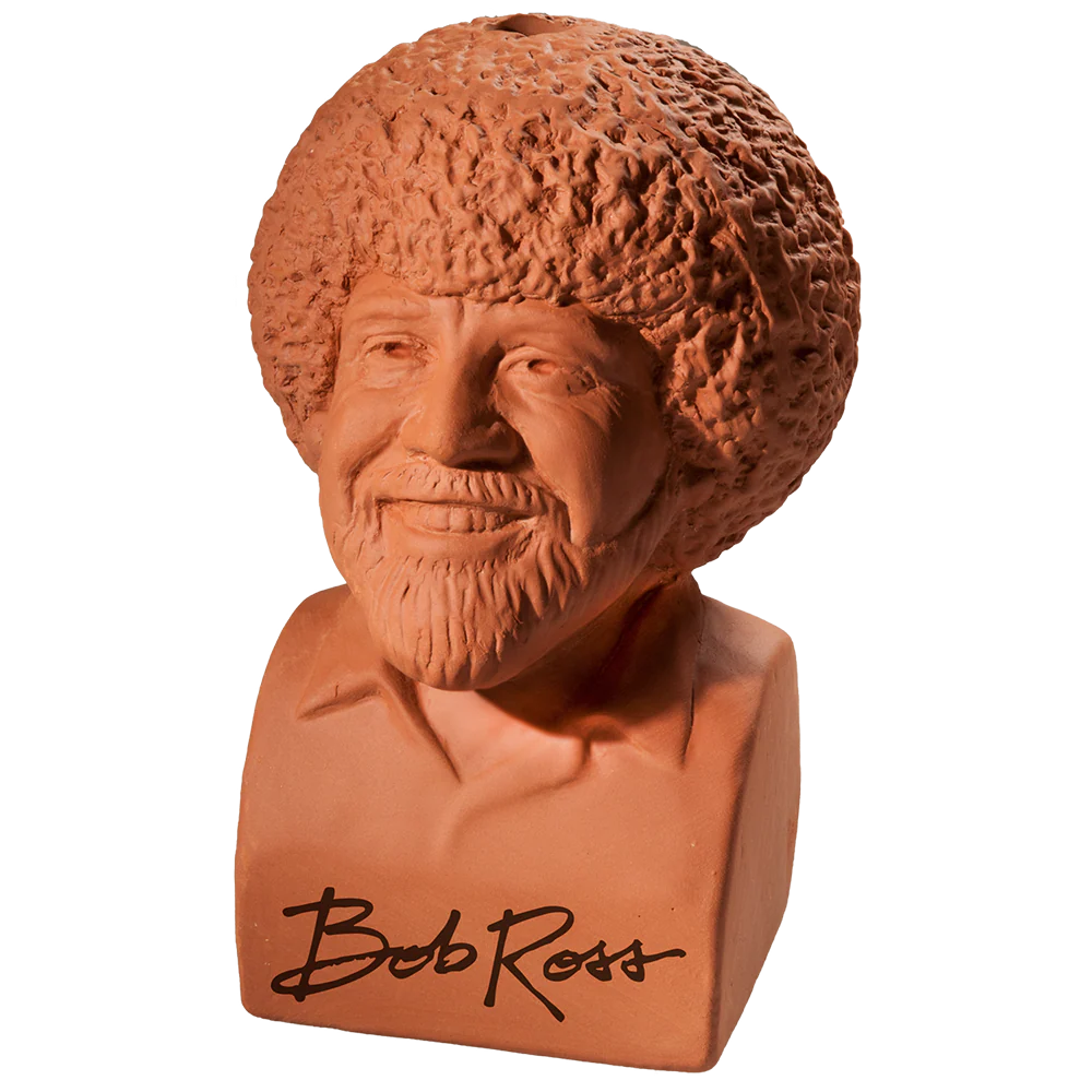 Grow your own happy little Chia plants with this Bob Ross Chia Pet® and add a bit of calming greenery to your home or office. This handmade planter is a highly detailed Bob Ross bust inscribed with his autograph and features his infamous afro as your Chia growing area. Bob Ross is best known for his instructional 80s TV show, “The Joy of Painting,” which aired for over a decade and taught viewers how to paint scenic landscape oil paintings. Bring his calm and soothing demeanor to your indoor garden and watch Bob’s hair grow into a lush green afro. Not only can Bob Ross teach painting techniques, but you can also use him to teach kids the science of plant growth. This Chia Pet is a great way to introduce kids to gardening and plant care since chia seeds are low maintenance and easy to grow. Whether you are a fan of Bob Ross, a lover of plants or simply looking for a fun and unique gift, the Bob Ross Chia Pet® is sure to bring joy and delight to anyone’s day as they start growing their own happy little garden!