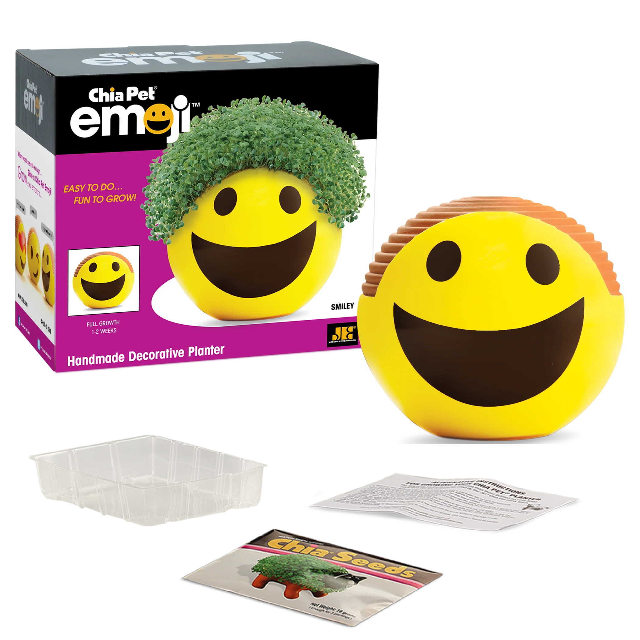If you're happy and you know it, grow your Chia! It's time to spread some joy with the Emoji Smiley Chia Pet. Just plant your chia seeds and watch your upbeat Emoji grow leafy green hair in just 1-2 weeks! Both kids and adults will love seeing their planter sprout within days and develop into a silly creation they can replant again and again. Add a fun new decoration to your home or give it as a gift and add some "YAY" to someone's day! Either way, this cute and cheerful Emoji planter can’t help but bring smiles all around!