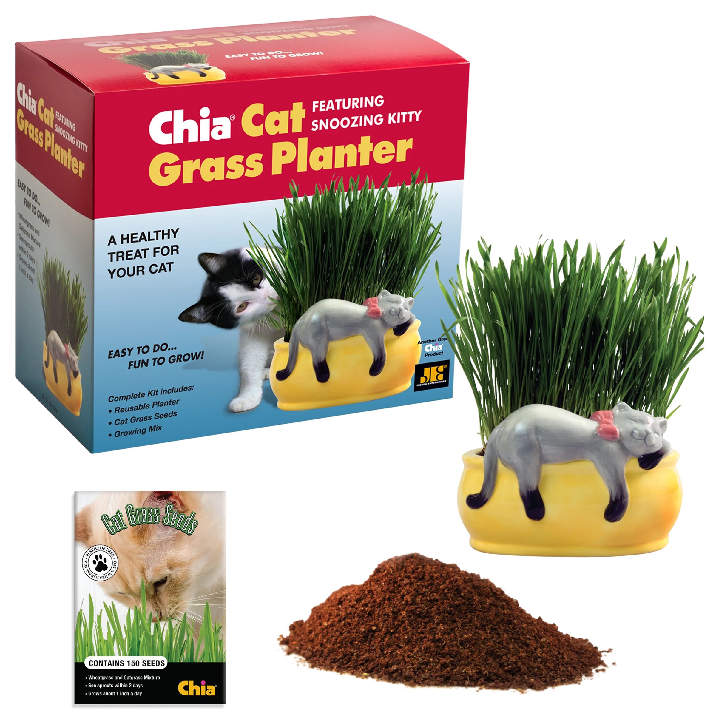 Here’s a fun and easy way to grow a fresh and healthy treat for your feline friend! The Snoozing Kitty Chia Cat Grass Planter is an adorable, eye-catching addition to your home décor. With a beautiful glazed sheen, this yellow planter features a happy gray cat doing what a cat does best... catching some ZZZ's! This cat is even wearing a pink bow collar for extra cuteness! Cat grass is a satisfying and interactive treat for your cat and is easy to grow. Once you plant your seeds, grass sprouts within a couple days and grows about an inch per day. Your cat will love nibbling these tender blades of healthy grass. It's the purr-fect gift for any cat lover!